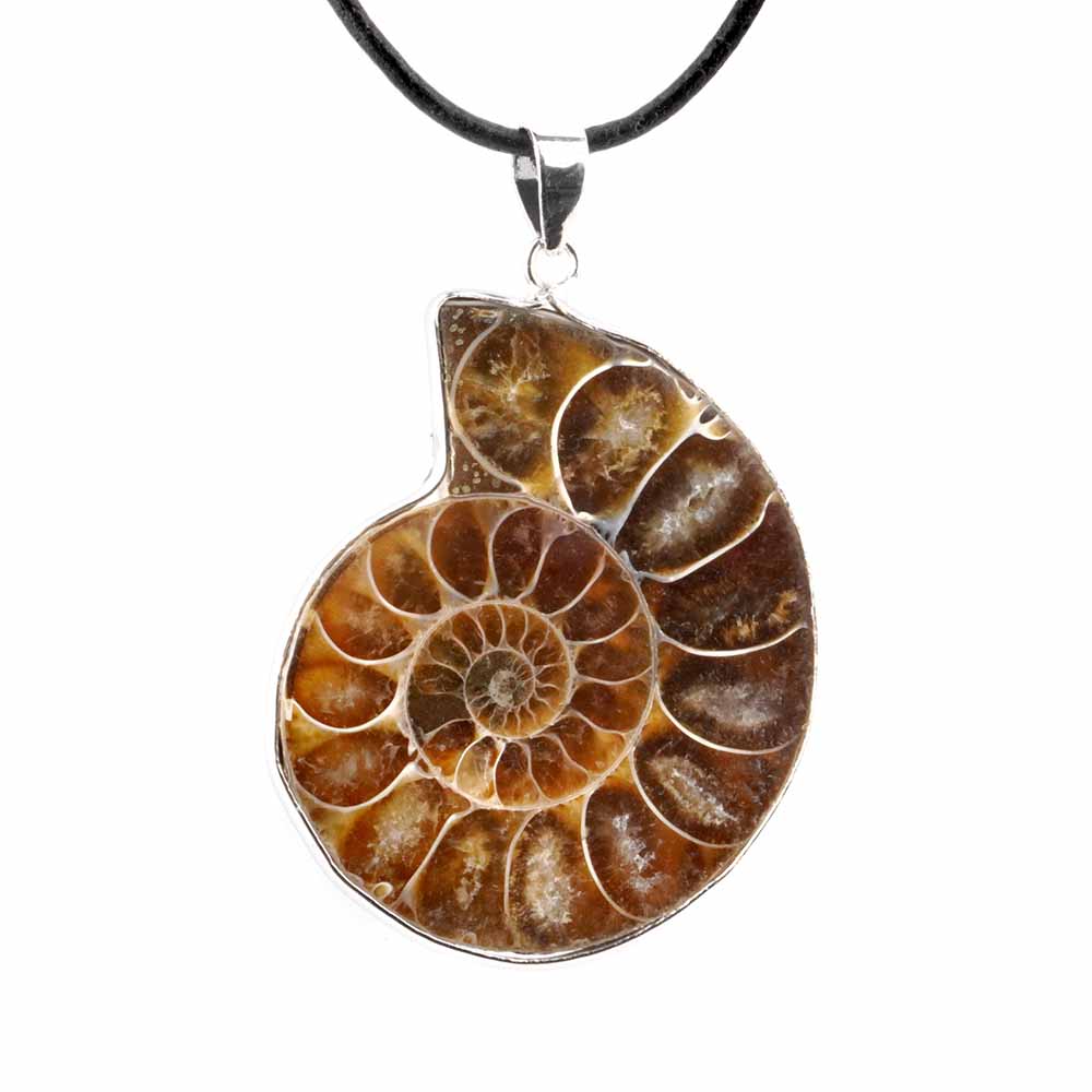 Die Öffnung der Wohnkammer des versteinerten Kopffüßers zeigt bei diesem Anhänger nach links.