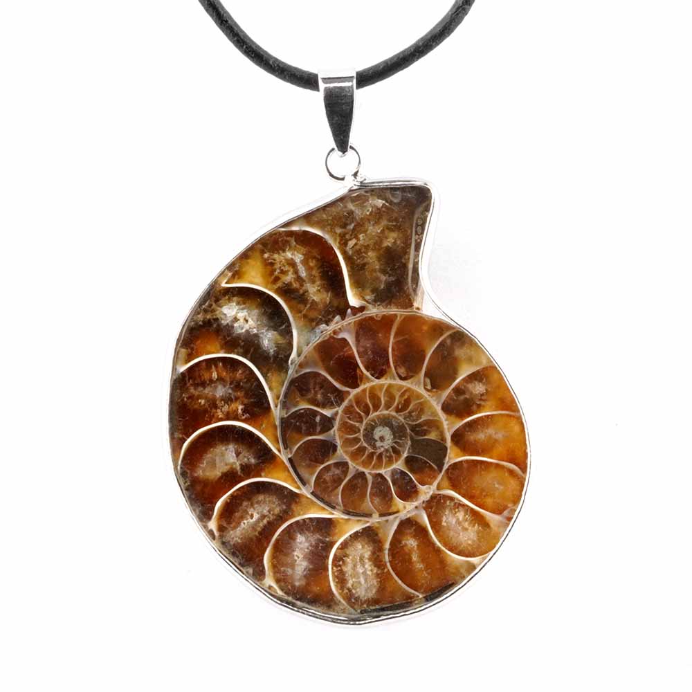 Die Öffnung der Wohnkammer des versteinerten Kopffüßers zeigt bei diesem Anhänger nach rechts.