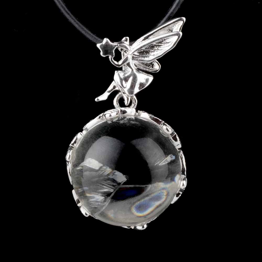 Sehr schöne Bergkristall Kugel, gefasst und gehalten von einer Fee mit rhodinierter Öse in klarer Qualität.