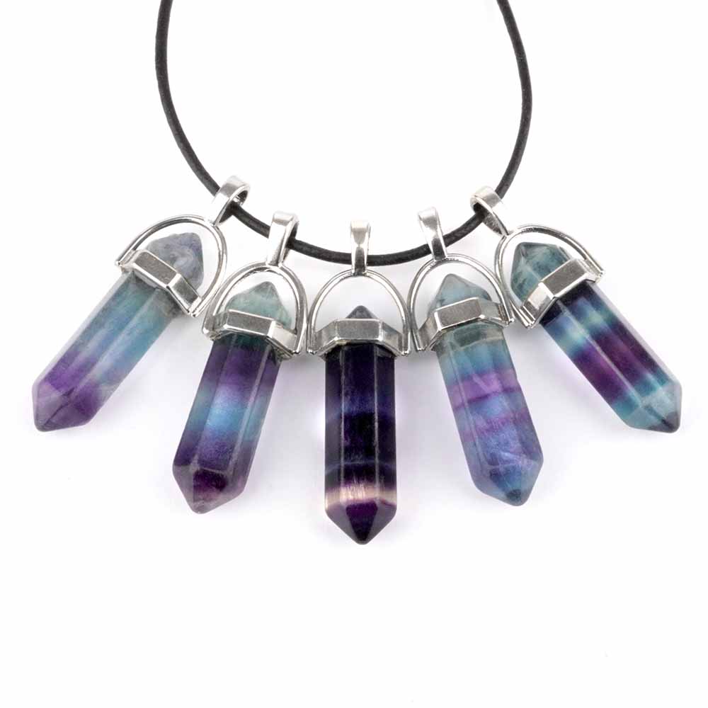 Fluorit bunt | Regenbogenfluorit wurde hier zu wunderschönen Spitzen-Anhängern verarbeitet.