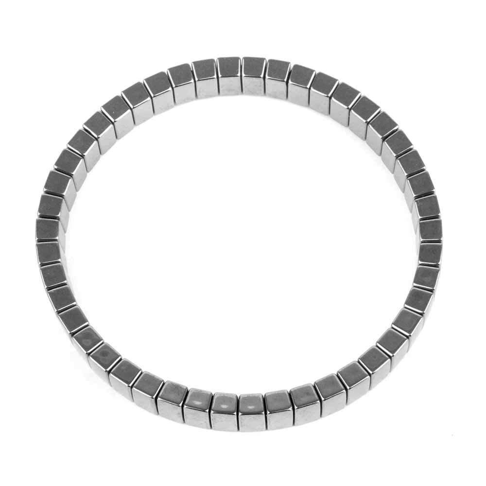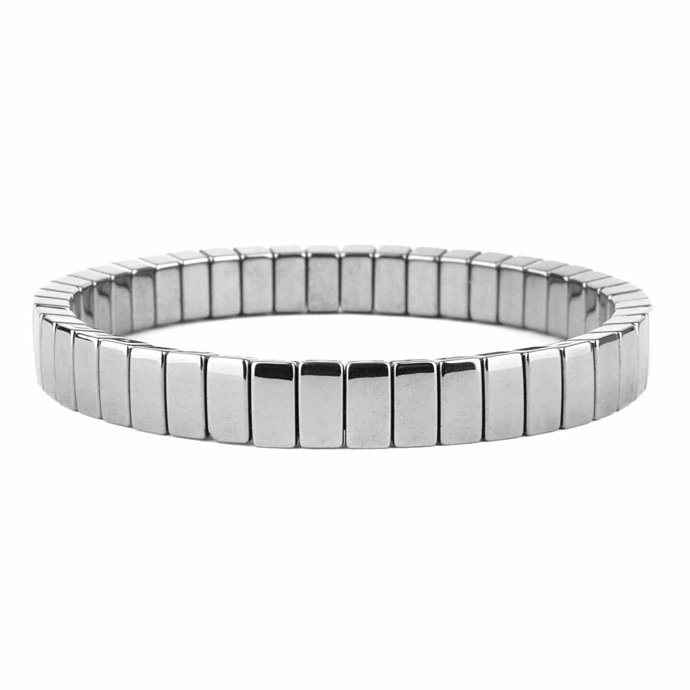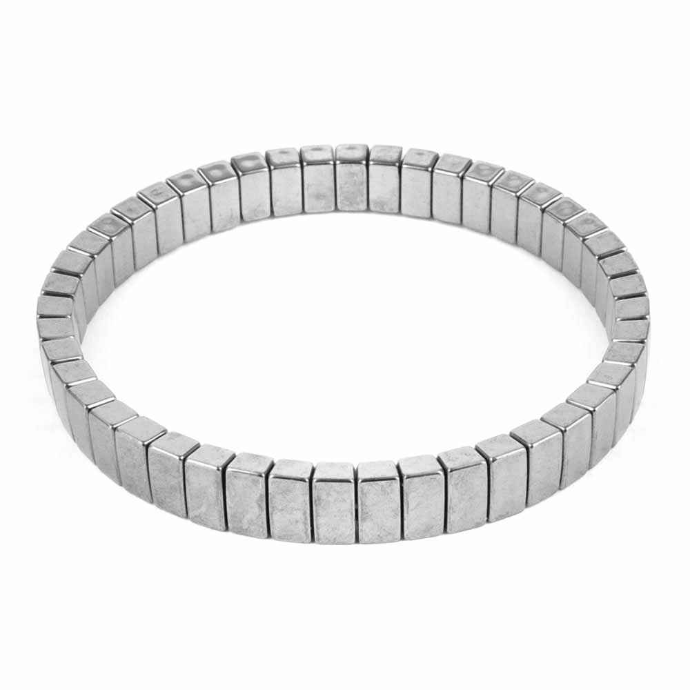 Geschliffene und polierte Hämatit Edelstein-Rechtecke, aufgefädelt auf ein flexibles Gummiband.