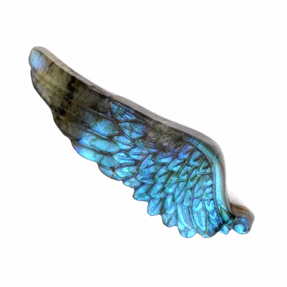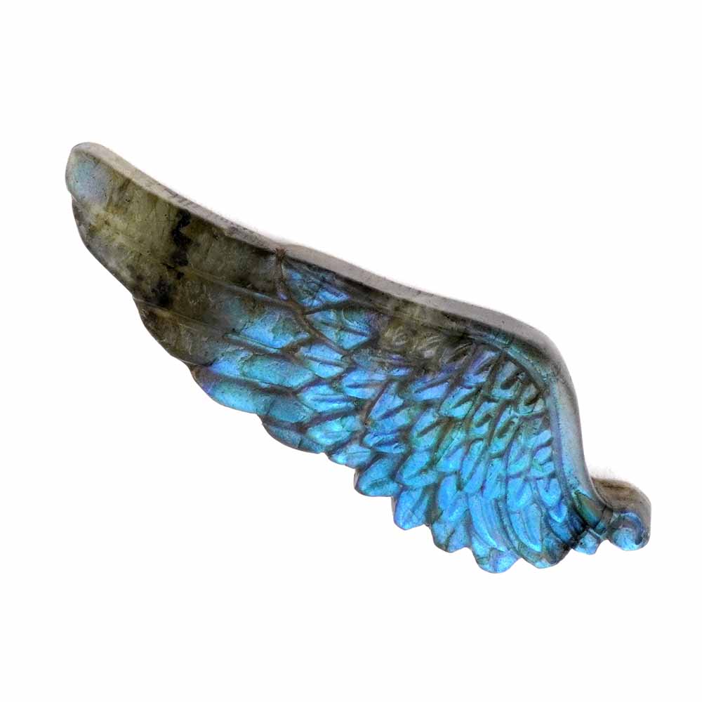 Labradorit in einzigartiger Qualität wurde hier zu einem Engelsflügel graviert. Ein einmaliges Einzelstück.