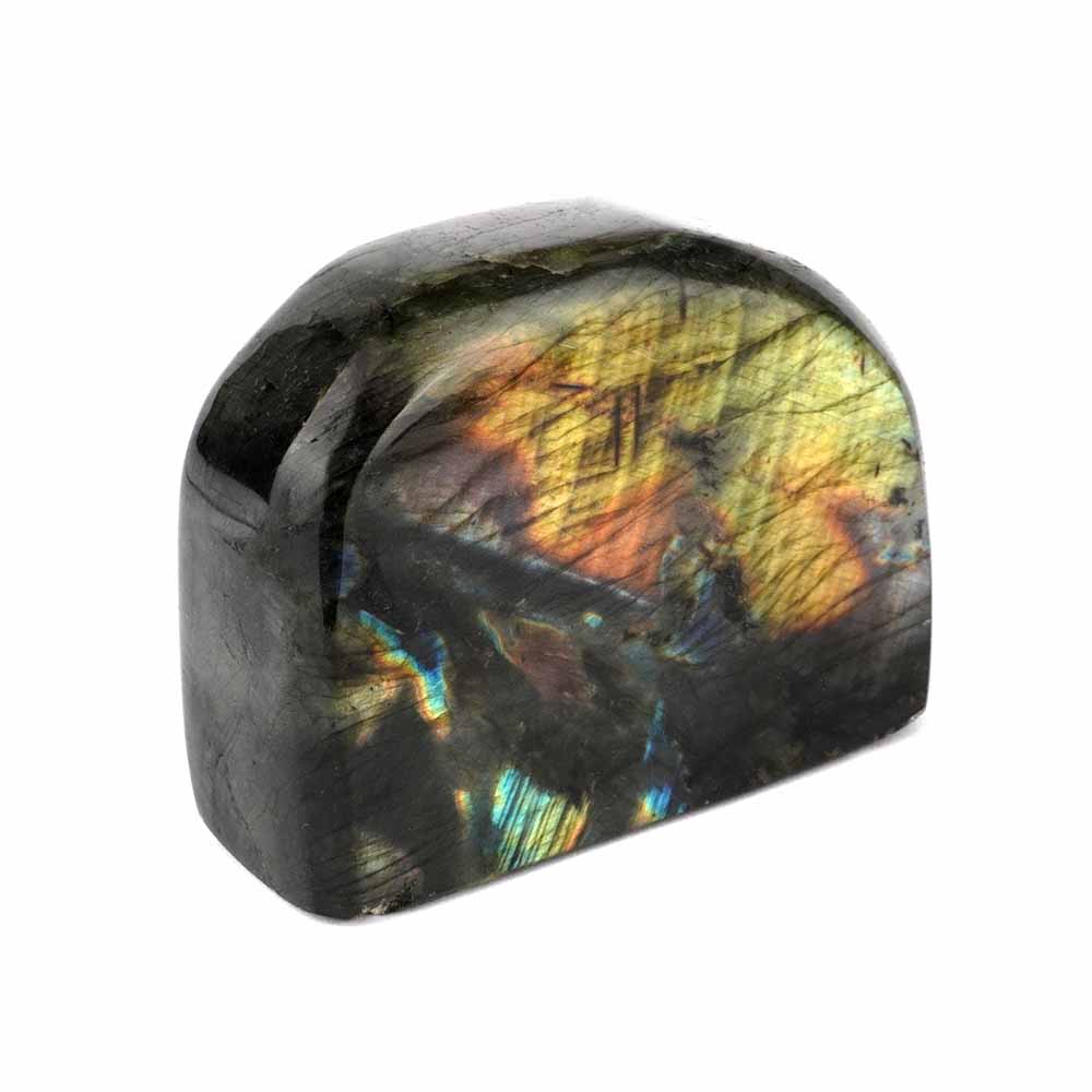 Der Labradorit hat eine Standfläche und ist damit eine ideale Dekoration. Bei Lichteinfall schillert er in vielen Farben. Er wurde von Hand auf allen Seiten geschliffen und poliert.