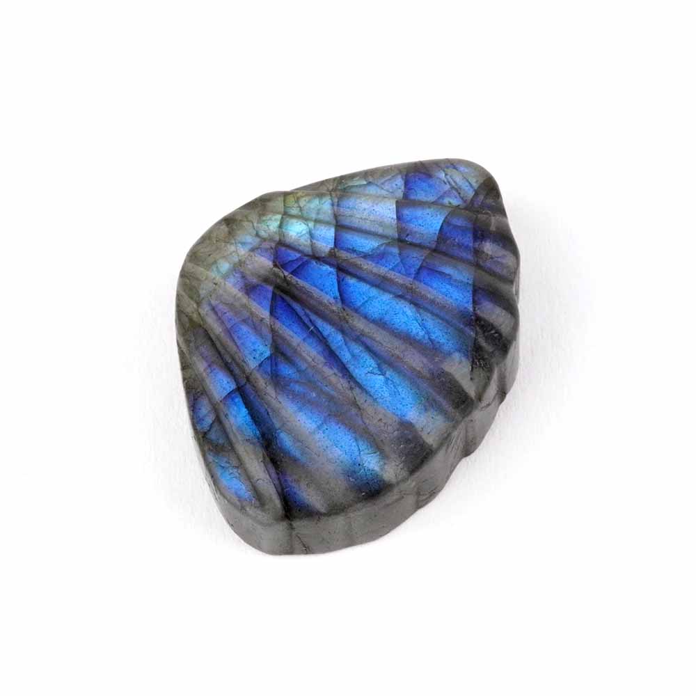 Labradorit in einzigartiger Qualität wurde hier zu einer Muschel graviert. Ein einmaliges Einzelstück.