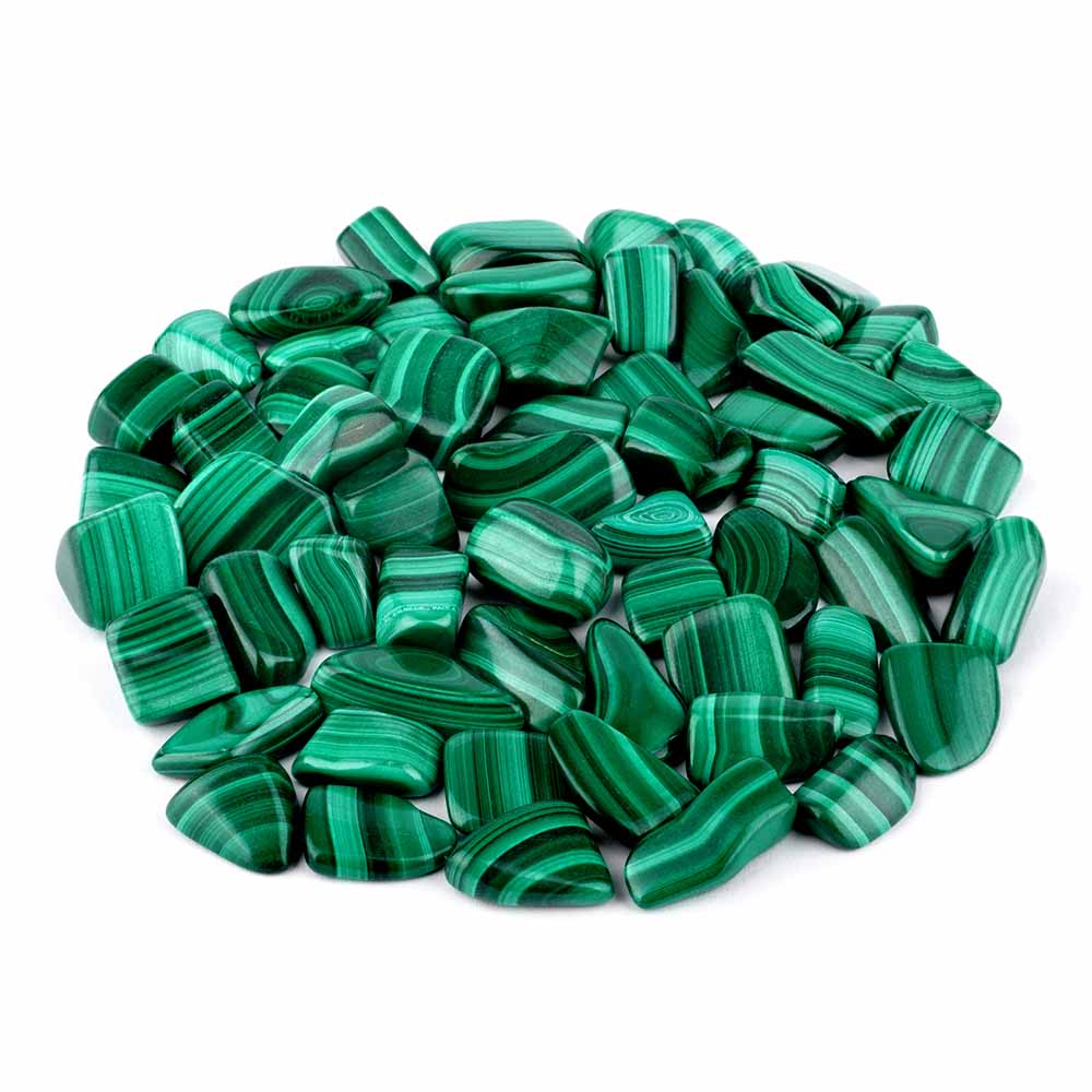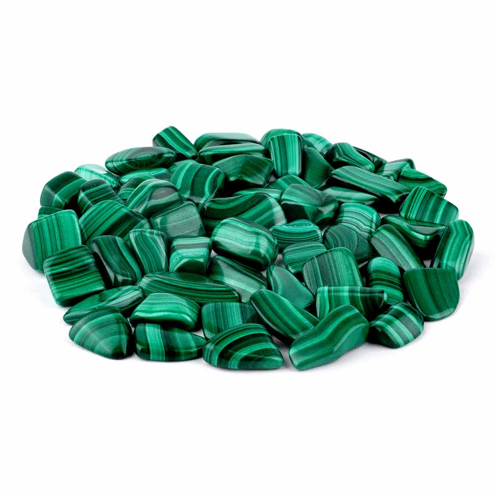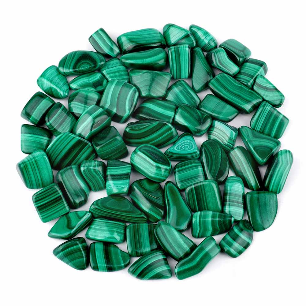 Bester Malachit wurde hier zu Trommelsteinen mit wunderschöner Maserung verarbeitet.