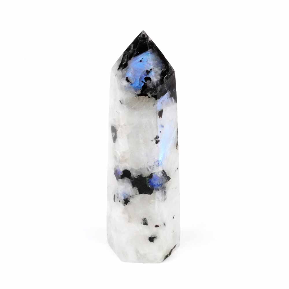 Regenbogen Mondstein Spitze mit schillerndem, blauem Schimmer. Bewege die Spitze im Licht, um das ganze Farbenspiel betrachten zu können…
