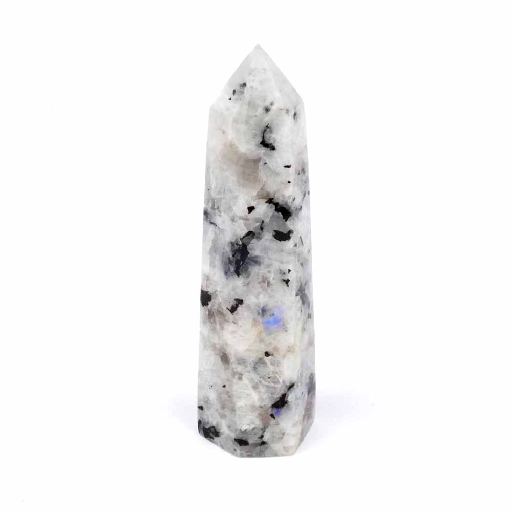 Regenbogen Mondstein Spitze mit schillerndem, blauem Schimmer. Bewege die Spitze im Licht, um das ganze Farbenspiel betrachten zu können…