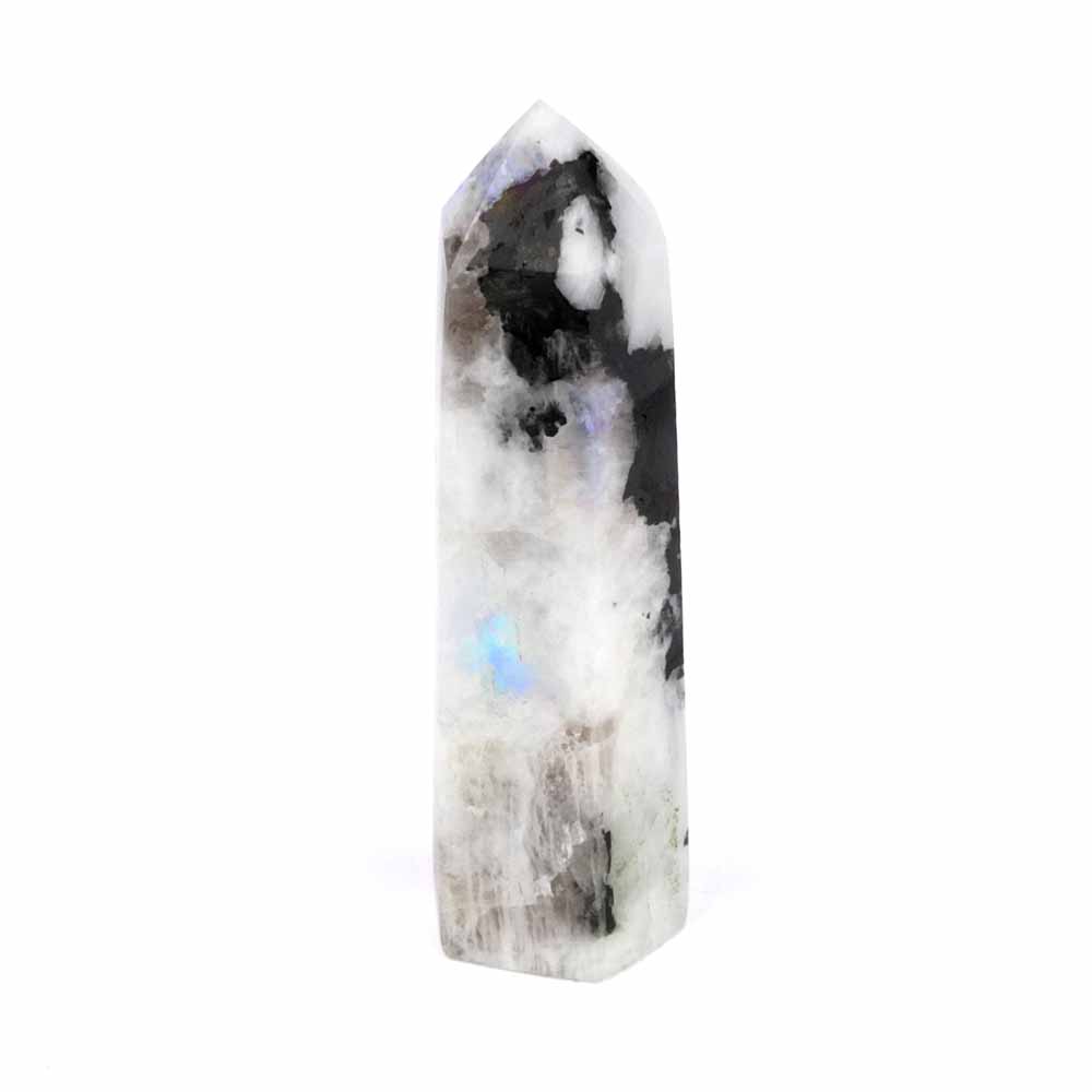 Regenbogen Mondstein Spitze mit schillerndem, blauem Schimmer. Bewege die Spitze im Licht, um das ganze Farbenspiel betrachten zu können…