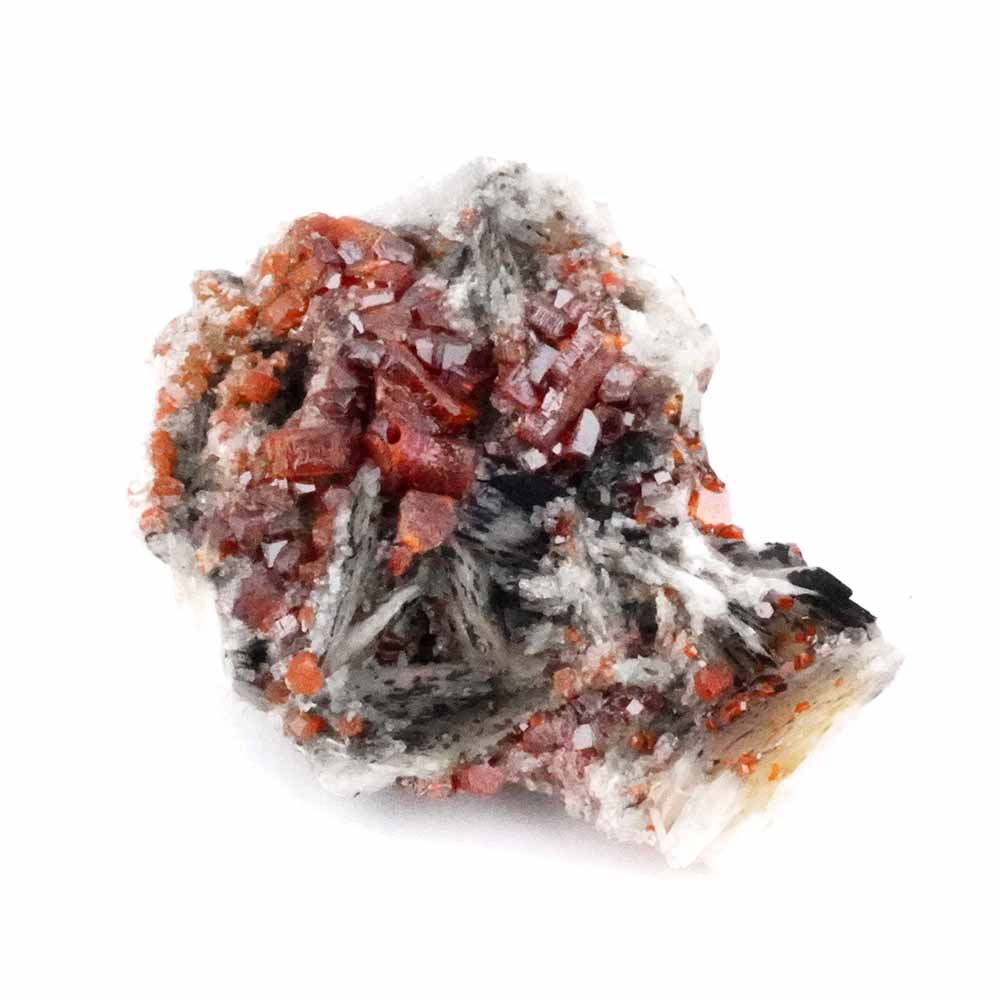 Seltene Vanadinit Stufe auf dunklem Baryt aus Marokko in sehr guter Qualität.
