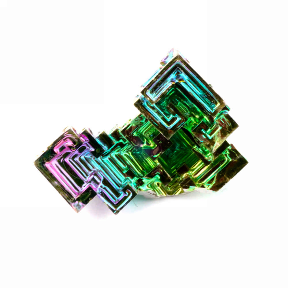 Wismut (Bi) kristallisiert unter bestimmten Laborbedingungen aus der Schmelze heraus. Die einzigartig geformten Kristalle gibt das Metall vor und die Farben entstehen in Verbindung mit Sauerstoff (Oxidation). Um klare Kristalle zu erhalten, benötigt man extrem reines Material.